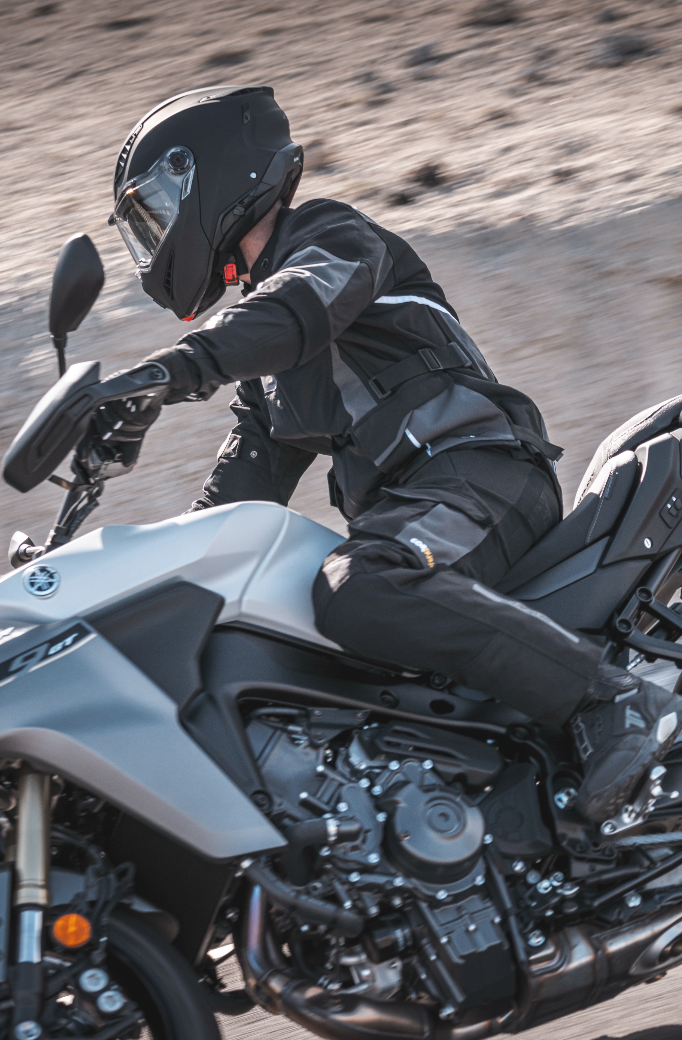 Hjälmen är utrustad med en praktisk solskärm (peak visor) som hjälper till att minska bländning från solen under körning. Solskärmen bidrar även till hjälmens sportiga och adventure-inspirerade design.