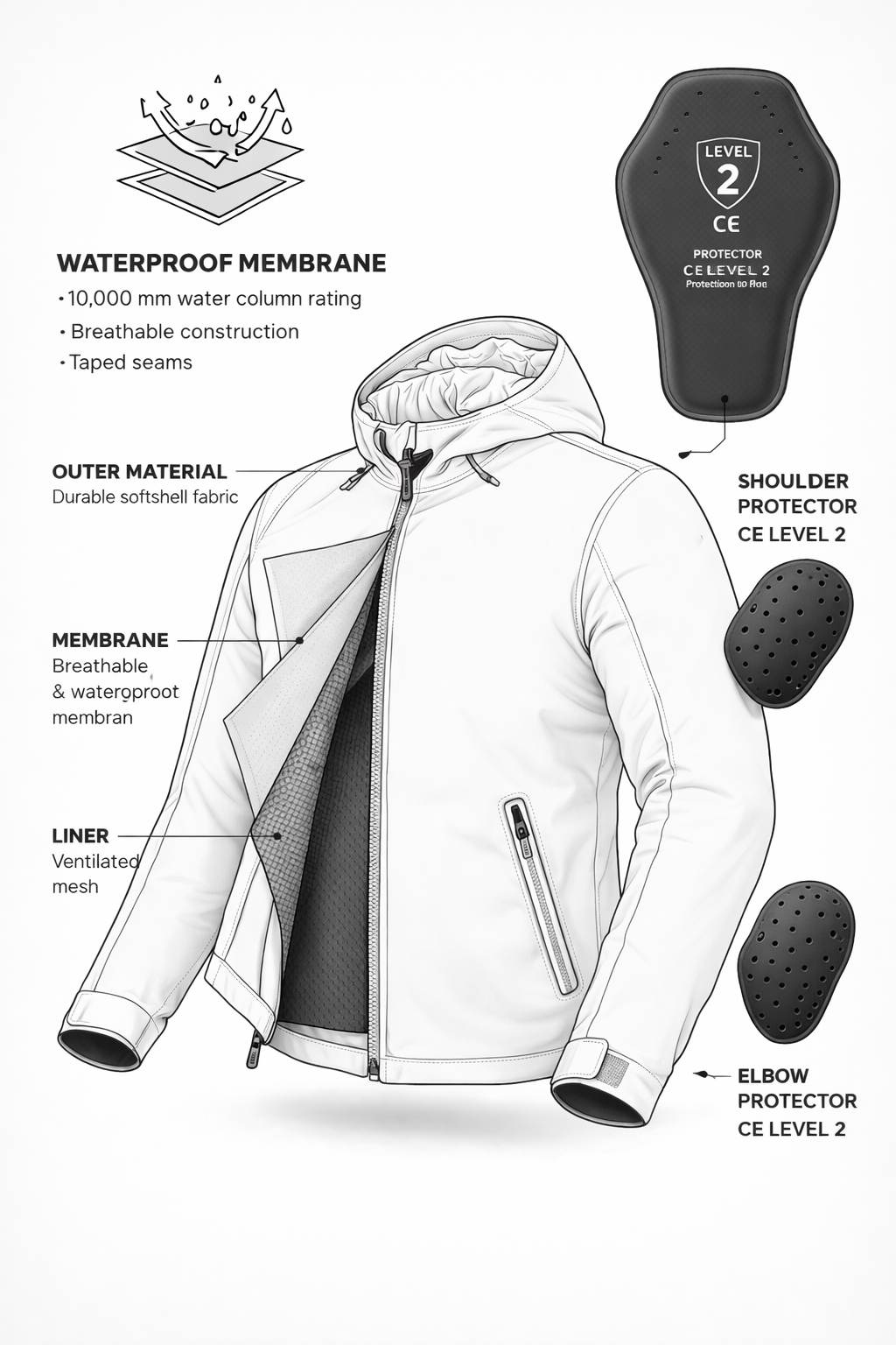 • Laminerad vattentät membran med tejpade sömmar – helt vind- och vattentät